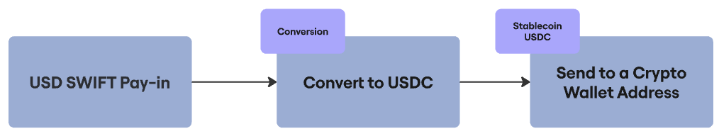 - Send USD via SWIFT and receive stablecoins like USDC directly in a crypto wallet.