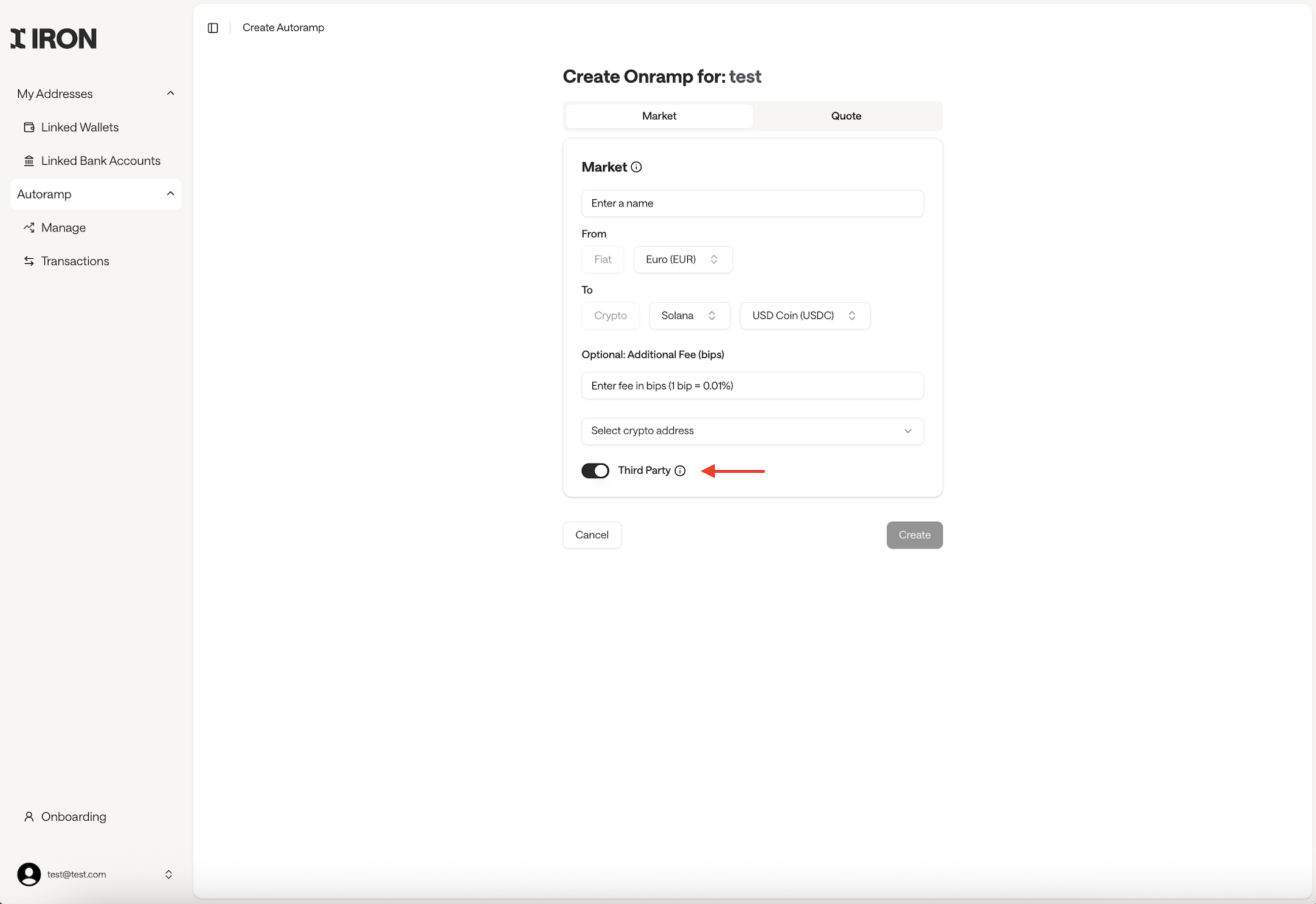 Iron enables the creation of Autoramp configurations that enable third party payment:- Onramp: Accept fiat payments from external bank accounts as a third-party source.